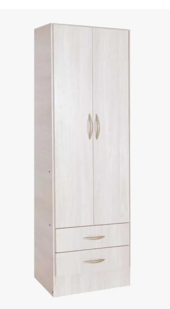 Armario alto de madera clara con dos puertas y dos cajones; tiradores plateados.